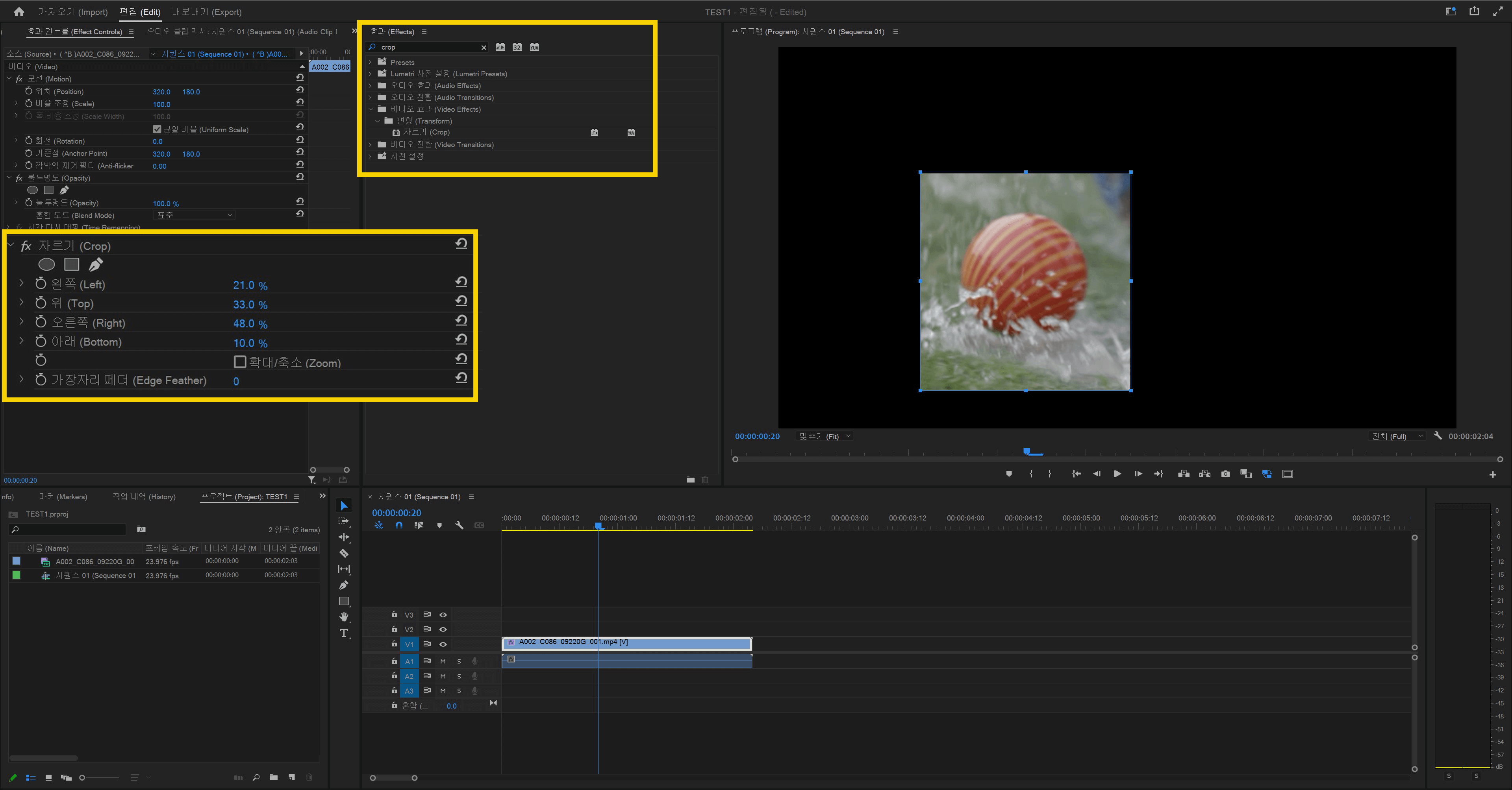 클립에 [자르기 (crop)] 기능이 적용됐더라도 아무 변화를 못 느끼셨을 텐데요, 아직 얼마나 자를지를 설정하지 않아서 변화가 없는 것입니다. [효과 컨트롤 (Effect Control)] 창으로 가보시면 하단에 'fx [자르기 (crop)]'라는 항목이 생긴 것을 확인할 수 있습니다. 여기서 왼쪽(Left), 위 (Top), 오른쪽 (Right), 아래(Bottom) 수치를 0%가 아닌 필요한 수치만큼 조정하면 화면이 크롭 됩니다.