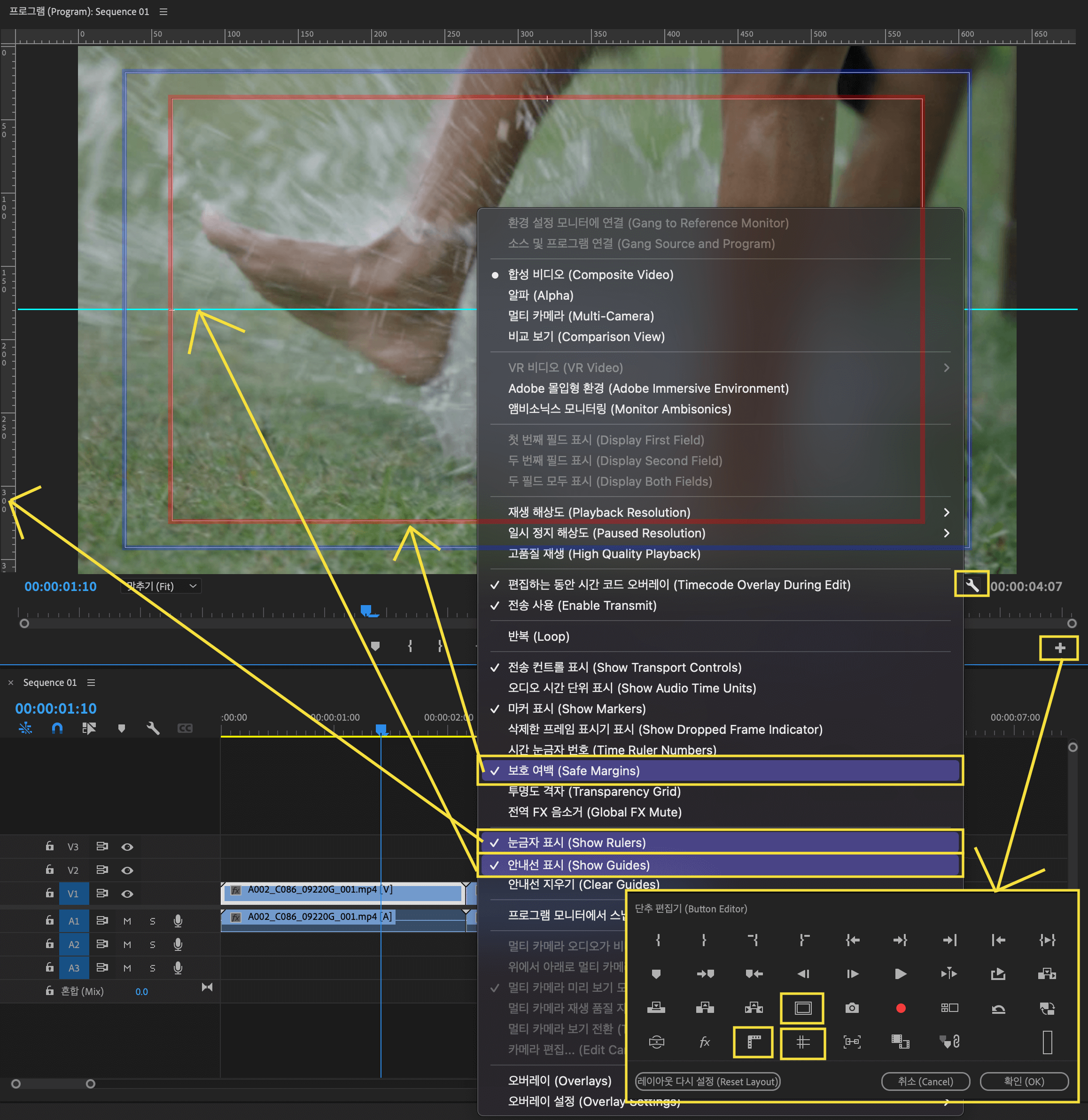 프로그램 모니터 패널 하단에 보면 [+] 표시가 있는데요, 이 [+] 버튼을 누르면 [단추 편집기 (Button Editor)]가 열립니다. 여기서 노란색으로 표시한 [ㅁ] 모양은 세이프 존 보기, [뒤집어진 ㄱ] 모양은 눈금자 표시, [#] 모양은 안내선 표시입니다. 이 아이콘들을 프로그램 패널 하단으로 드래그 앤 드롭해 주면 클릭 한 번으로 껐다 켰다 할 수 있습니다.