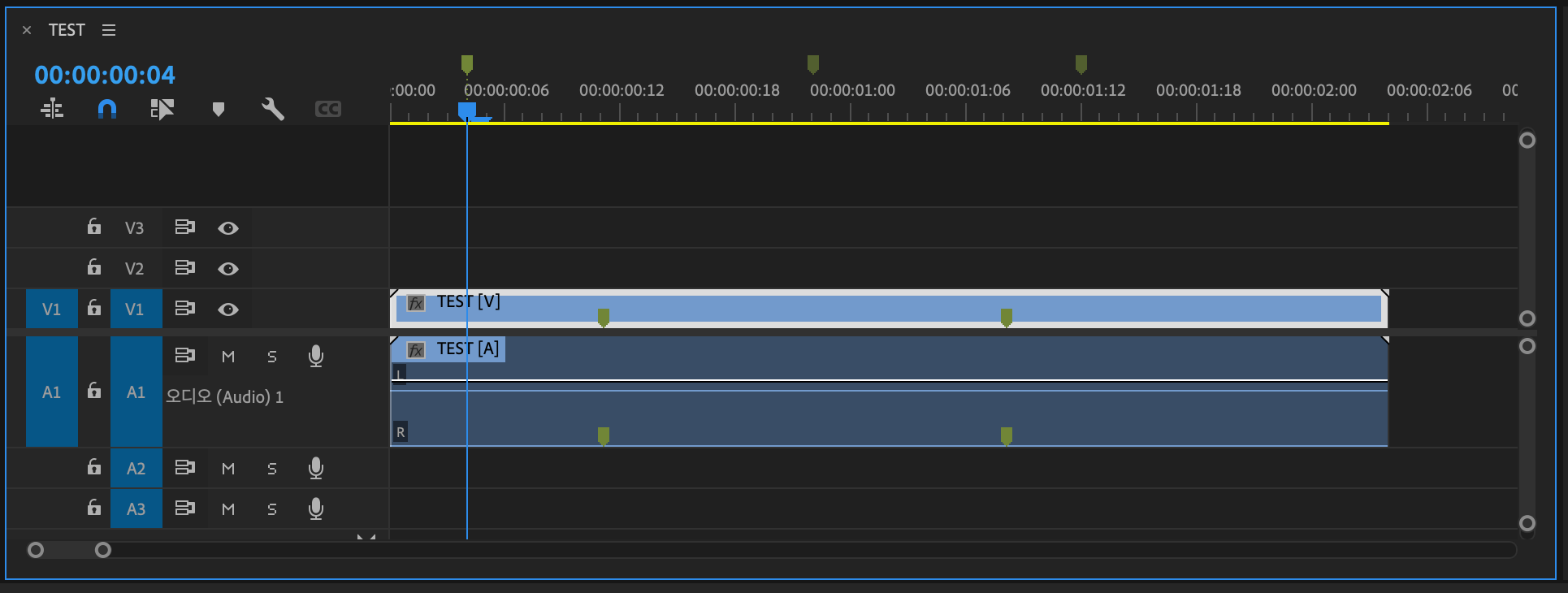 마커를 표시하는 방법은 아주 쉽습니다. 상단 메뉴바에서 [마커 (Makers)] - [마커 추가 (Add Marker)]를 눌러줘도 되고, 단축키 [M]을 눌러줘도 됩니다. 보통 간편하게 사용할 수 있는 단축키를 많이 이용하는 편입니다. 한 가지 주의할 사항은 위의 사진처럼 어떤 클립이 선택되어 있을 때는 클립 안쪽으로 마커가 찍히고, 타임라인 내에서 아무 클립이 선택되어 있지 않을 때에는 타임라인의 상단에 있는 시간표시 부분에 마커가 찍힙니다. 경우에 따라서 두 가지를 다 활용해야 하는 경우가 있습니다.