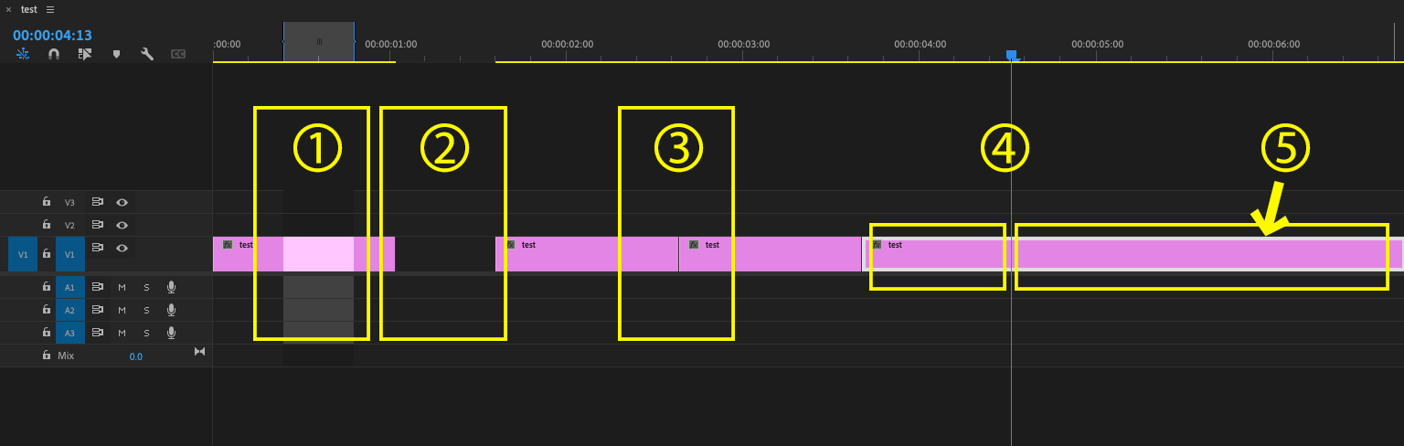 그림에서 ④번이 있는 구간을 보겠습니다. 타임라인 위에 플레이헤드가 놓여져 있는데요. 이 상태에서 [Q]를 누르게 되면 플레이헤드가 있는 지점이 시작 부분이 되어 영상 앞부분이 지워집니다. 잘라지면서 영상은 ④번의 뒷쪽 긴 네모박스에 위치한 영상만이 남게 되고 영상은 클립의 첫 부분으로 이동하게 됩니다. 반대로 [W]를 누르게 되면 플레이헤드가 있는 지점이 끝부분이 되어 영상 뒷부분이 잘립니다. 잘리면서 영상은 ④번의 앞쪽 작은 네모박스 부분만 남게 되고 뒤에 있는 소스들이 앞으로 당겨지게 됩니다. 글로는 설명이 거창하지만 직접 프리미어를 켜서 하나하나 눌러보시면 어떤 느낌인지 금방 감이 오실 것입니다.